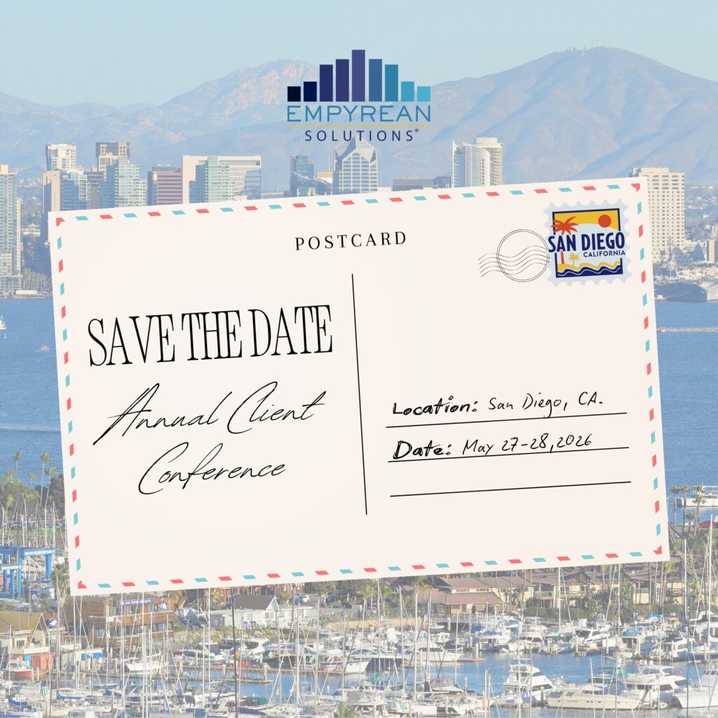 Save the Date! The Empyrean Solutions Annual Client Conference is headed to San Diego in 2026. Mark your calendars for May 27-28, 2026 and join us for two days of educational sessions, roundtable discussions, peer networking, and a lot of fun. Registration details coming soon!
